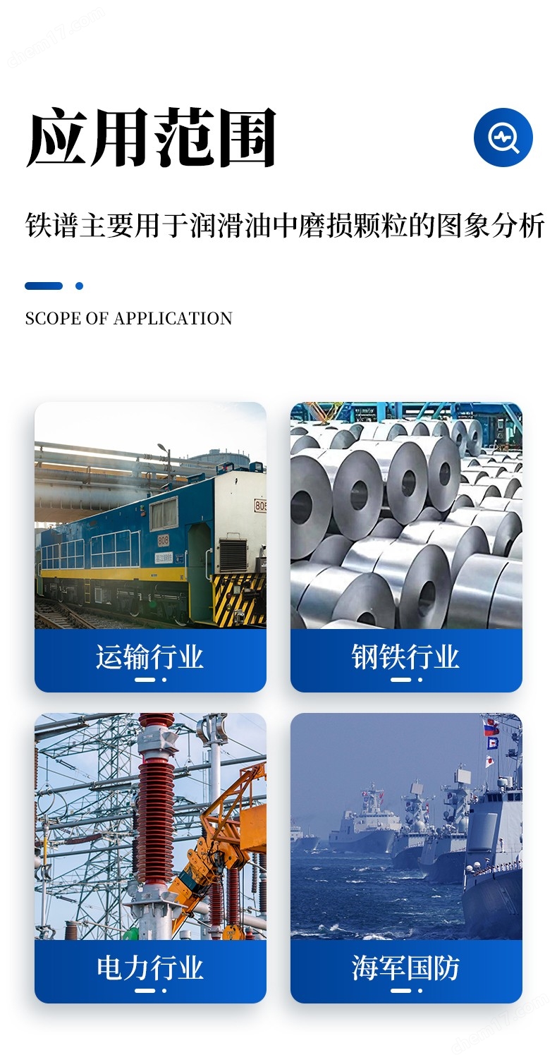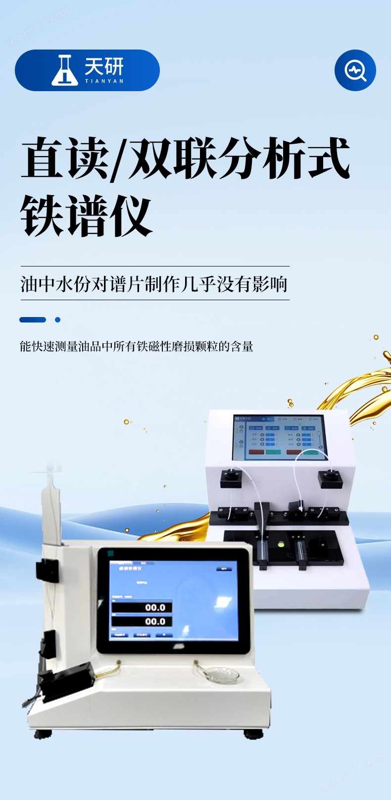 雙聯分析式鐵譜儀:鐵譜分析技術是設備狀態監測和預測維修的重要技術之一,此技術能夠準確可靠地預測機器潤滑部件的磨損狀態和潛在故障,并推進維修行動來優化設備的利用和效率。我司開發的鐵譜分析技術創立了設備診斷的標準,廣泛地應用于世界范圍的油液分析實驗室中。鐵譜主要用于潤滑油中磨損顆粒的圖象分析。鐵譜技術是利用磁場作用,將機器潤滑油樣中的鐵磁磨損顆粒和粘附物微粒分離出來,并分析其沉積分離的形態、尺寸、數量、粒度分布等情況,從而得到磨損過程的有關信息。與SHT0573-1993在用潤滑油磨損顆粒試驗法(分析式鐵譜法)標準試驗方法一致。利用鐵譜技術,可以對機械設備運行中的磨損狀態進行診斷、監測,從而提高系統的可靠性和安全性。應用鐵譜技術的重要工具之一就是鐵譜儀。