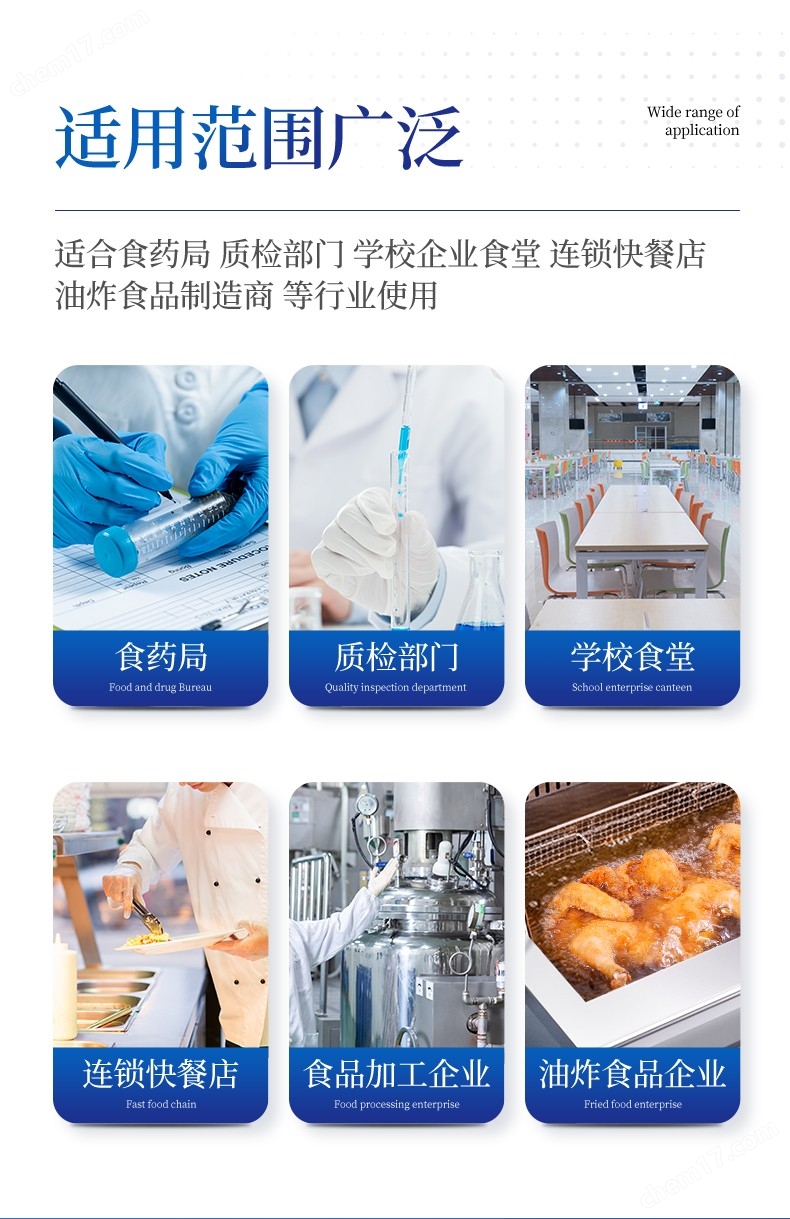 食用油品質成分檢測儀特別適合食藥局、質檢部門、學校企業食堂、連鎖快餐店、食品加工企業、油炸食品制造商、面包房等行業使用,也可以用于實驗室對食用油品質的初步篩選,對劣質油、地溝油的鑒別等。能為您達到檢驗油品品質、節省食用油、保證產品的質量、保證食品安全的目的。
